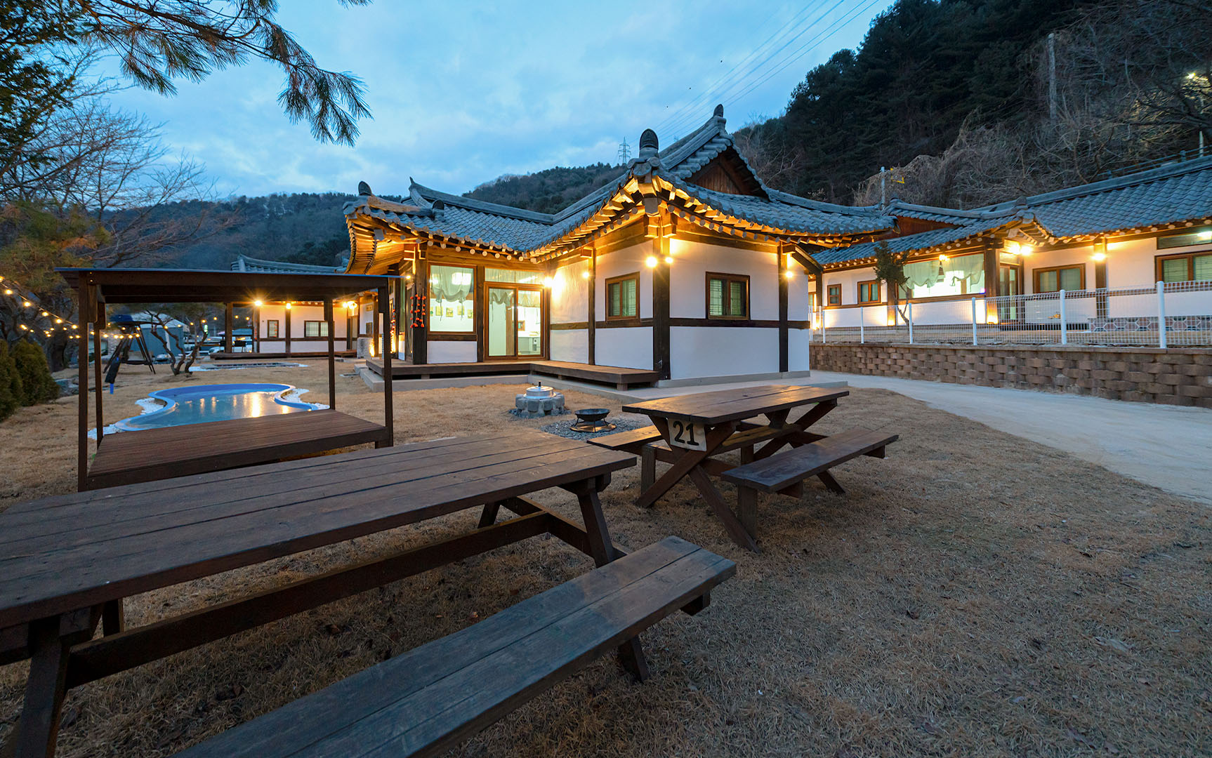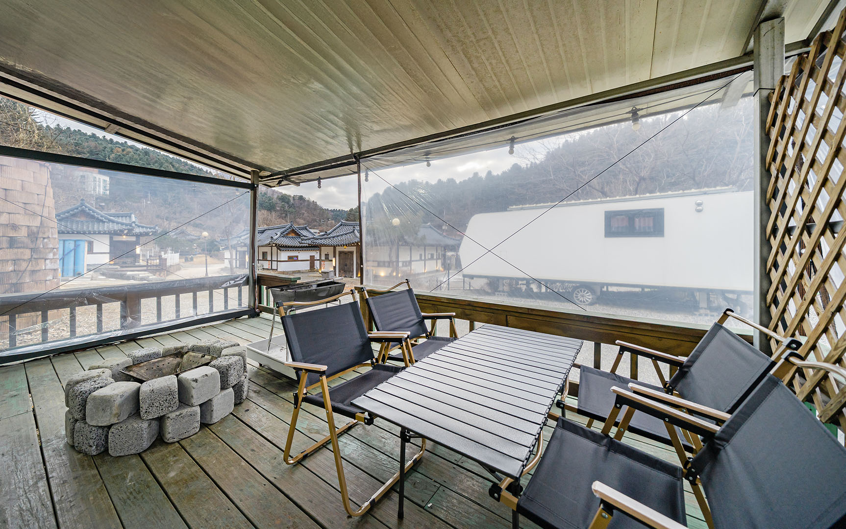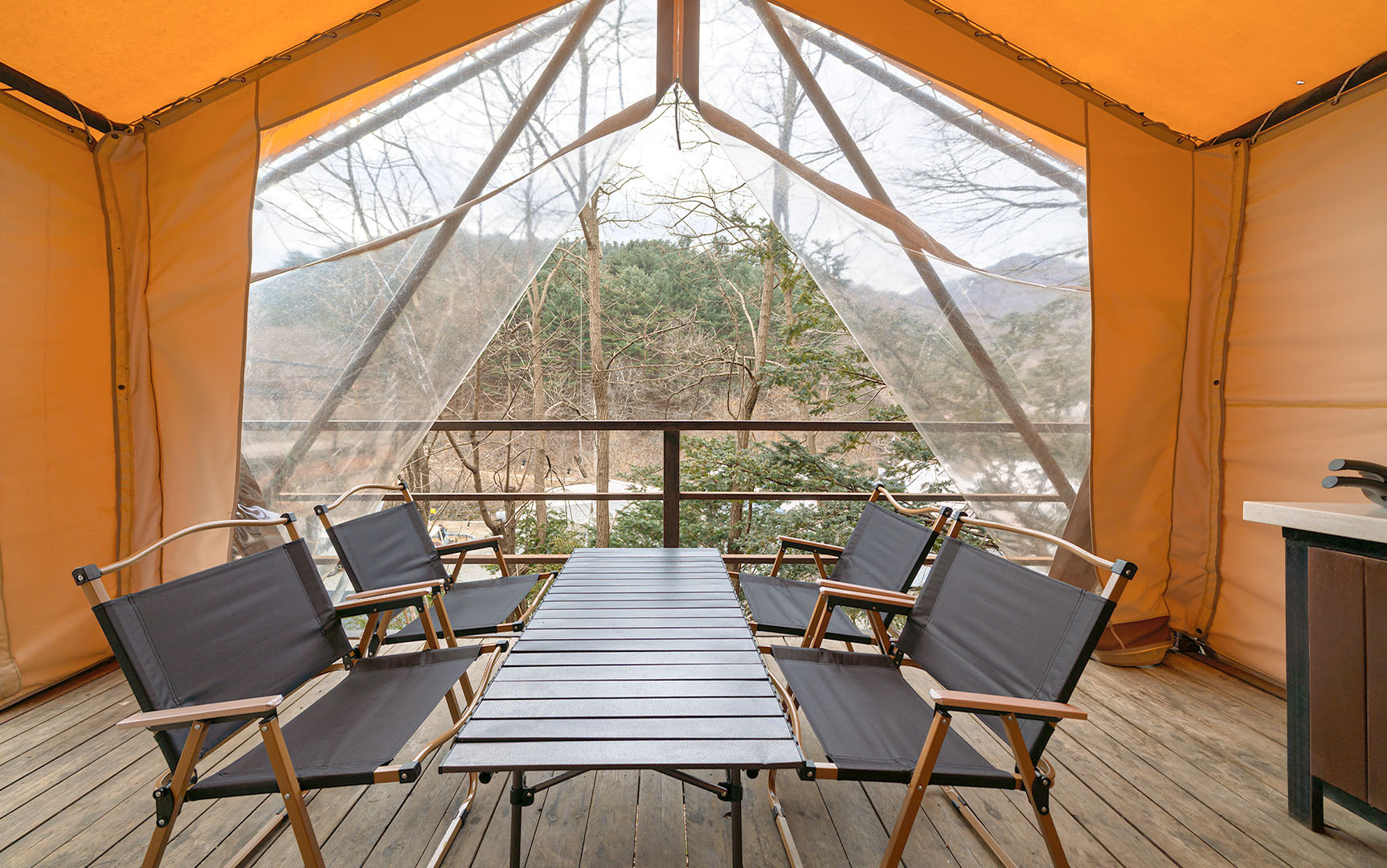글램핑장 앞, 카라반 앞에 시원한 물소리가 흐르는 계곡이 위치해 있습니다.